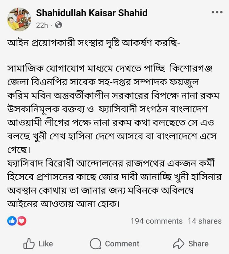 এর মধ্যে জেলা স্বেচ্ছাসেবক দলের সদস্যসচিব শহীদুল্লাহ কায়সার লিখেছেন, ‘আইন প্রয়োগকারী সংস্থার দৃষ্টি আকর্ষণ করছি—সামাজিক যোগাযোগ মাধ্যমে দেখা যাচ্ছে, কিশোরগঞ্জ জেলা বিএনপির সাবেক সহ-দপ্তর সম্পাদক ফয়জুল করিম মুবিন অন্তর্বর্তীকালীন সরকারের বিরুদ্ধে নানা ধরনের উসকানিমূলক বক্তব্য দিচ্ছেন এবং ফ্যাসিবাদী সংগঠন আওয়ামী লীগের পক্ষে নানা মন্তব্য করছেন।