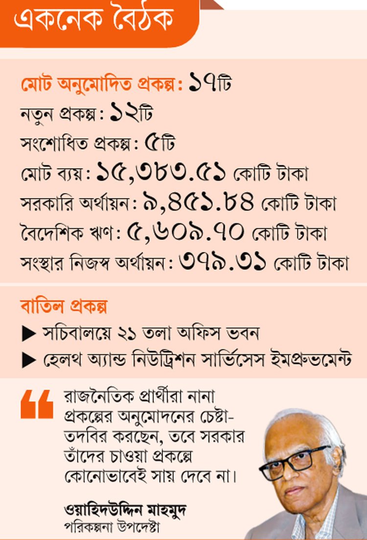 প্রধান উপদেষ্টা ড. মুহাম্মদ ইউনূসের সভাপতিত্বে এই ষষ্ঠ একনেক সভায় ১২টি নতুন, পাঁচটি সংশোধিতসহ মোট ১৭টি প্রকল্প অনুমোদিত হয়েছে, যার বাস্তবায়নে ব্যয় ধরা হয়েছে ১৫ হাজার ৩৮৩ কোটি ৫১ লাখ টাকা। এতে সরকারি অর্থায়ন নির্ধারণ করা হয়েছে ৯ হাজার ৪৫১ কোটি ৮৪ লাখ টাকা, বৈদেশিক ঋণ ৫ হাজার ৬০৯ কোটি ৭০ লাখ টাকা এবং সংস্থার নিজস্ব অর্থায়ন ৩৭৯ কোটি ৩১ লাখ টাকা। এই সভায় সচিবালয়ে নতুন ২১ তলা অফিস ভবন এবং হেলথ অ্যান্ড নিউট্রিশন সার্ভিসেস ইমপ্রুভমেন্ট অ্যান্ড সিস্টেম স্ট্রেনদেনিং প্রকল্প বাতিল করা হয়।