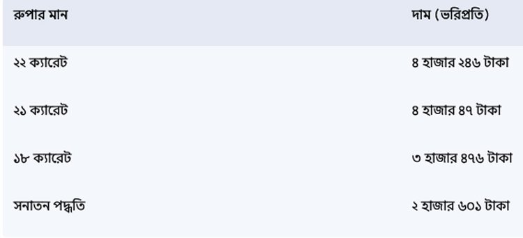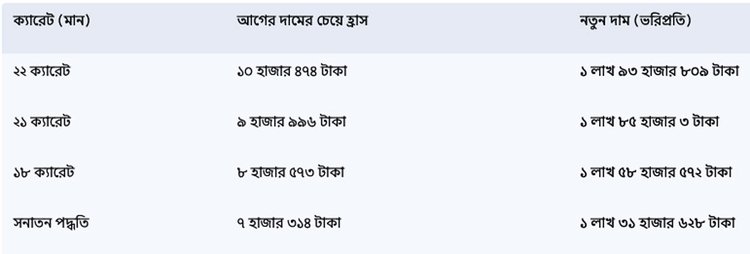 আজ বুধবার থেকে কার্যকর হওয়া নতুন দাম অনুযায়ী, বিভিন্ন মানের সোনার ভরিপ্রতি মূল্য নিম্নরূপ: