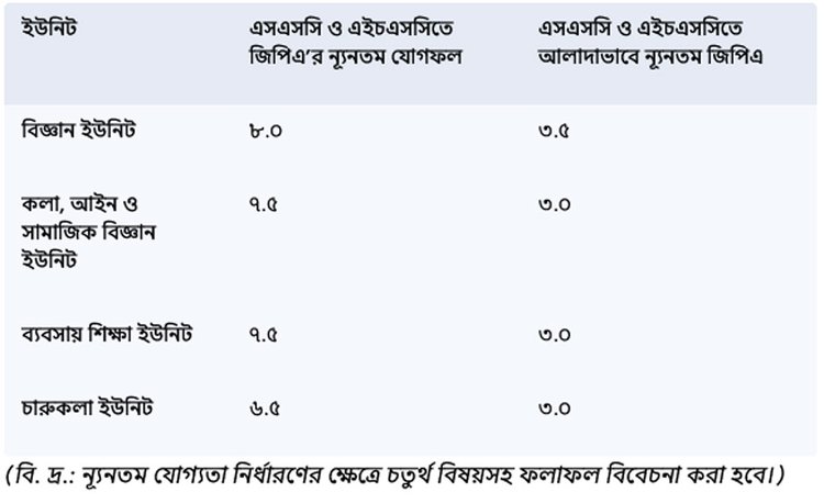 অন্যান্য ইউনিট (বিজ্ঞান, কলা ও সামাজিক বিজ্ঞান, ব্যবসায় শিক্ষা) :