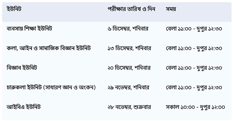 ২০২৫-২৬ শিক্ষাবর্ষের ভর্তি পরীক্ষাগুলো ঢাকাসহ আটটি বিভাগীয় শহরে অনুষ্ঠিত হবে। চারুকলা ইউনিট ও আইবিএ ইউনিট ছাড়া অন্য তিনটি ইউনিটের পরীক্ষা রাজশাহী বিশ্ববিদ্যালয়, চট্টগ্রাম বিশ্ববিদ্যালয়, বরিশাল বিশ্ববিদ্যালয়, খুলনা বিশ্ববিদ্যালয়, শাহজালাল বিজ্ঞান ও প্রযুক্তি বিশ্ববিদ্যালয়, বাংলাদেশ কৃষি বিশ্ববিদ্যালয়, ময়মনসিংহ/কবি নজরুল বিশ্ববিদ্যালয় ত্রিশাল এবং বেগম রোকেয়া বিশ্ববিদ্যালয়ে অনুষ্ঠিত হবে।