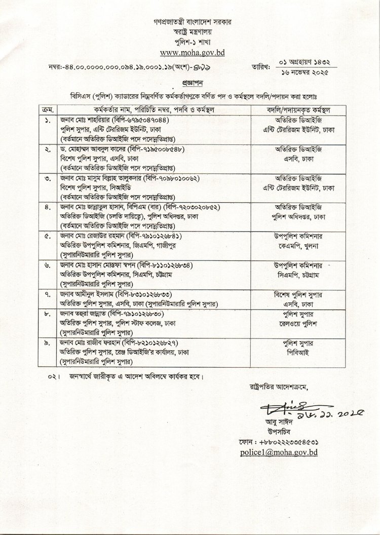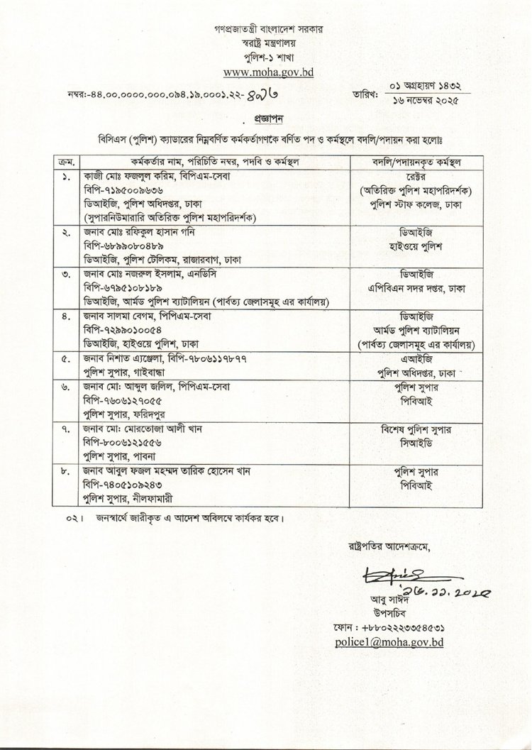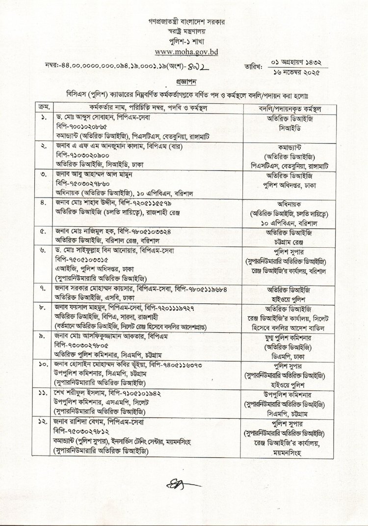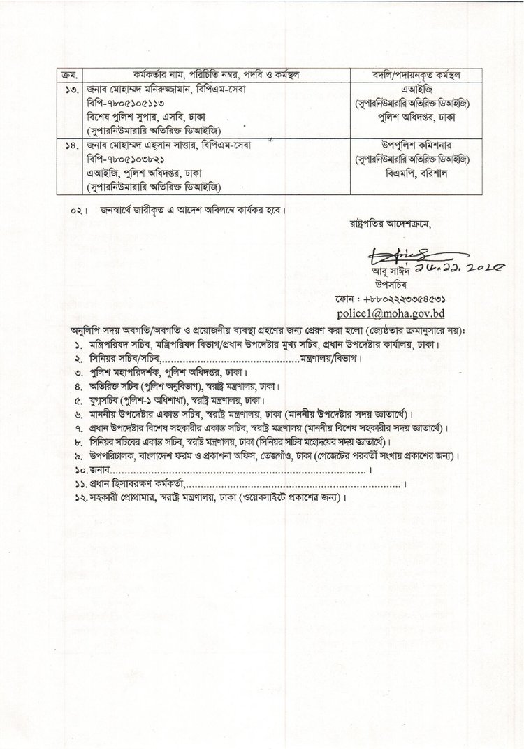 বদলি হওয়া কর্মকর্তাদের মধ্যে পুলিশ টেলিকমের ডিআইজি মো. রফিকুল হাসান গনিকে হাইওয়ে পুলিশে, আর্মড পুলিশ ব্যাটালিয়নের ডিআইজি মো. নজরুল ইসলামকে এবিপিএন সদর দপ্তরে, গাইবান্ধার পুলিশ সুপার নিশাত এ্যাঞ্জেলাকে পুলিশ সদর দপ্তরে, ফরিদপুরের পুলিশ সুপার মো. আব্দুল জলিলকে পিবিআইয়ে, পাবনার পুলিশ সুপার মো. মোরতোজা আলী খানকে সিআইডিতে এবং নীলফামারীর পুলিশ সুপার আবুল ফজল মহম্মদ তারিক হাসান খানকে পিবিআইয়ে বদলি করা হয়েছে।