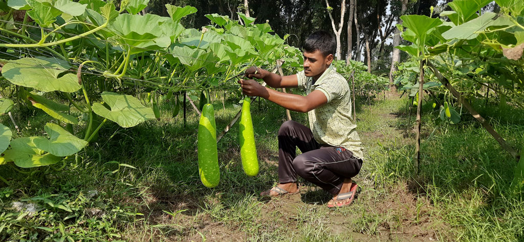 টাটকা সবজির চাহিদা বাজারে একটু বেশিই থাকে। সেই সঙ্গে দামও বেশ ভালো পাওয়া যায়। তাই বাজারে বিক্রির করার জন্য সকালে খেত থেকে লাউ কাটছেন কৃষি উদ্যোক্তা রাকিব হোসেন। আজ সকালে যশোরের ঝিকরগাছার হাজিরালী টাওয়ার মাঠ থেকে তোলা। ছবি: মাসুদুর রহমান মাসুদ